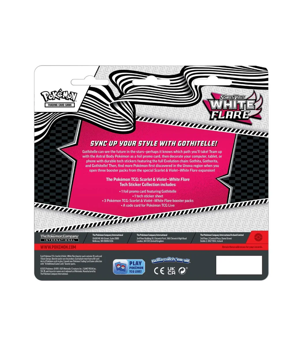 Gothitelle can see the future in the stars—perhaps it knows which path you’ll take! Team up with the Astral Body Pokémon as a foil promo card, then decorate your computer, tablet, or phone with durable tech stickers featuring the full Evolution chain: Gothita, Gothorita, and Gothitelle! Then, find more Pokémon first discovered in the Unova region when you open three booster packs from the special Scarlet & Violet—White Flare expansion!