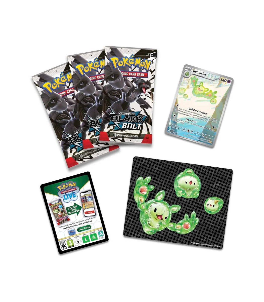 Would you shake hands with the Multiplying Pokémon? Team up with Reuniclus as a foil promo card that can evolve your entire Bench at once, then decorate your computer, tablet, or phone with durable tech stickers featuring the full Evolution chain: Solosis, Duosion, and Reuniclus! Then, find more Pokémon first discovered in the Unova region when you open three booster packs from the special Scarlet & Violet—Black Bolt expansion!