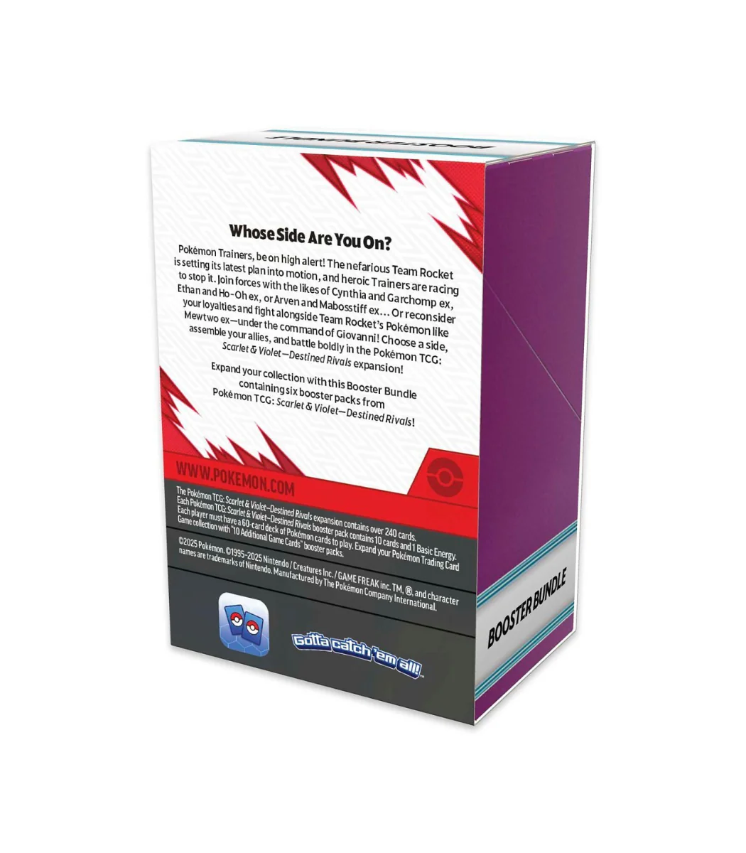 Pokémon Trainers, be on high alert! The nefarious Team Rocket is setting its latest plan into motion, and heroic Trainers are racing to stop it. Join forces with the likes of Cynthia and Garchomp ex, Ethan and Ho-Oh ex, or Arven and Mabosstiff ex… Or reconsider your loyalties and fight alongside Team Rocket’s Pokémon like Mewtwo ex—under the command of Giovanni! Choose a side, assemble your allies, and battle boldly in the Pokémon TCG: Scarlet & Violet—Destined Rivals expansion!